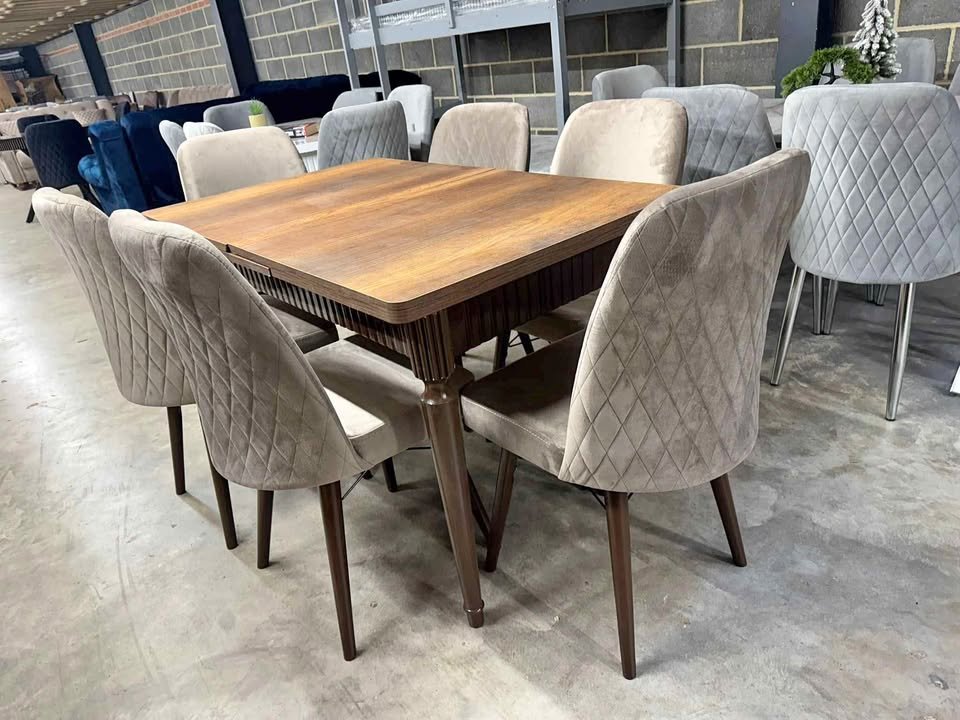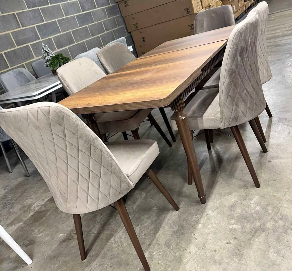 Our Solid Wood 6-Seater Dining Table Set is a stylish and elegant addition to modern UK homes. Featuring a smooth, high-quality wooden tabletop paired with comfortable beige velvet chairs, this dining set offers a perfect mix of contemporary design, durability, and everyday practicality.